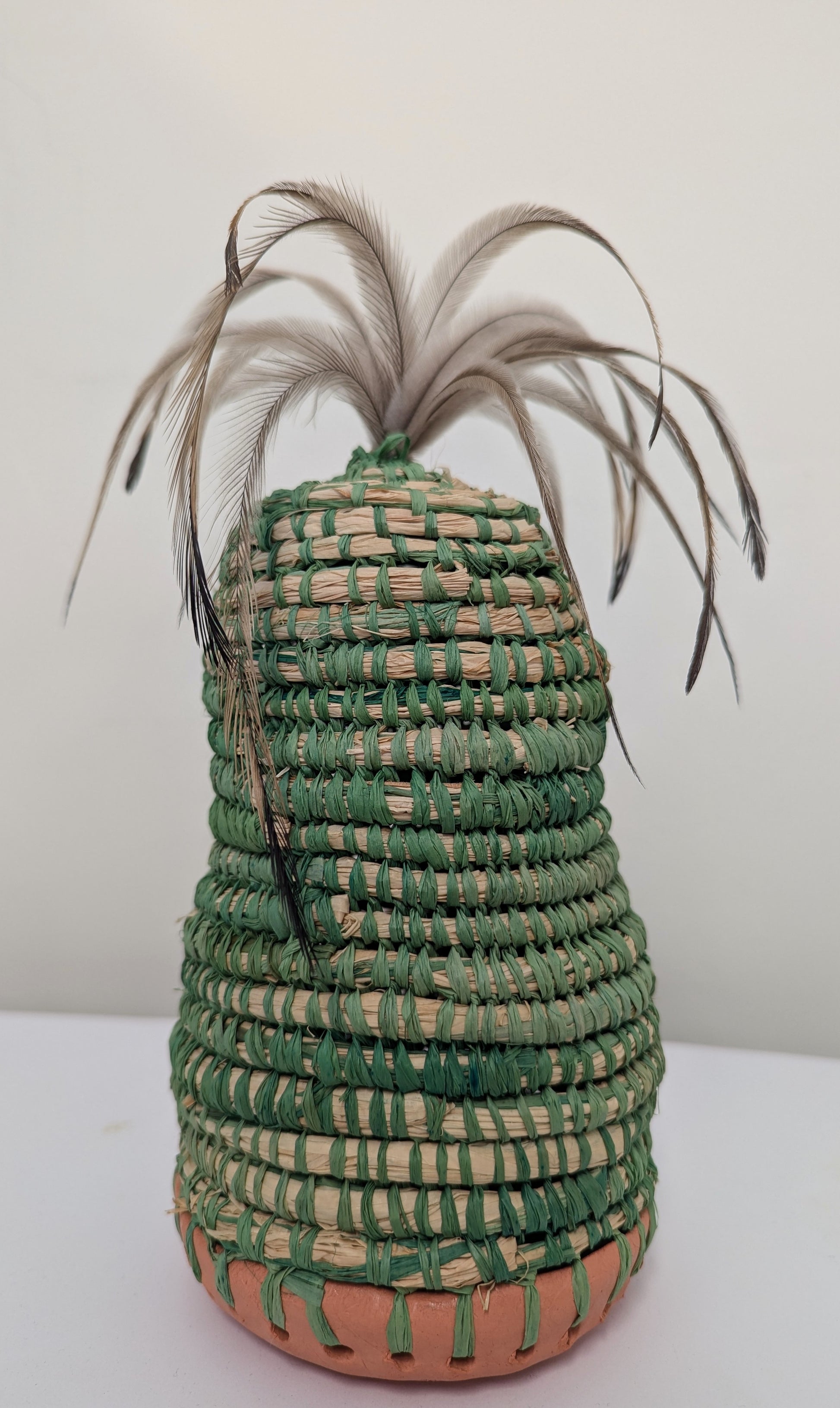 Green Woven Vase with Emu Feathers - Trish Cerminara (Gamilaroi)